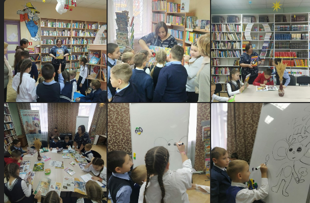 располагаются они на стеллажах, что такое карточки и для чего нужен каталог, чем отличается абонемент от читального зала и много другой нужной информации. Кроме того, школьники познакомились с правилами пользования библиотекой и бережного отношения к книгам. Дети с удовольствием рассматривали журналы, книжки - малышки, энциклопедии на разные тематики. Вместе с библиотекарем вспоминали произведения детских писателей, героев которых с удовольствием изобразили на флипчарте. Экскурсия получилась интересной и познавательной. Юные книгочеи получили массу впечатлений и положительных эмоций.