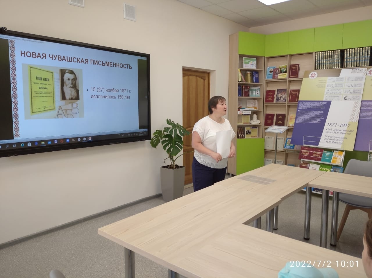 Чувашский язык относится к древнейшим языкам и является единственным живым представителем булгарской ветви, одной из двух крупных ветвей тюркской языковой семьи.Об истории чувашского языка и письменности поведал библиотекарь Центральной библиотеки детям из пришкольного оздоровительного лагеря при ВСОШ №2. Участники мероприятия узнали, кто способствовал развитию чувашского языка, и кем являлись эти люди. В дополнение был проведён библиографический обзор выставки книг, привезённой из Национальной библиотеки.
